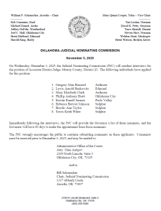 On Wednesday, December 3, 2025, the Judicial Nominating Commission (JNC) will conduct interviews for the position of Associate District Judge, Murray County, District 20. The following individuals have applied for this position: