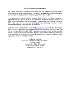 Application forms may be obtained online at https://okjnc.com or by contacting Gina Antipov at (405) 556-9300. Applications must be submitted to the Chairman of the JNC no later than 5:00 p.m., Friday, December 20, 2024. Applications may be mailed, hand delivered or delivered by third party commercial carrier. If mailed or delivered by third party commercial carrier, they must be postmarked on or before December 20, 2024, to be deemed timely. Applications should be mailed/delivered to: